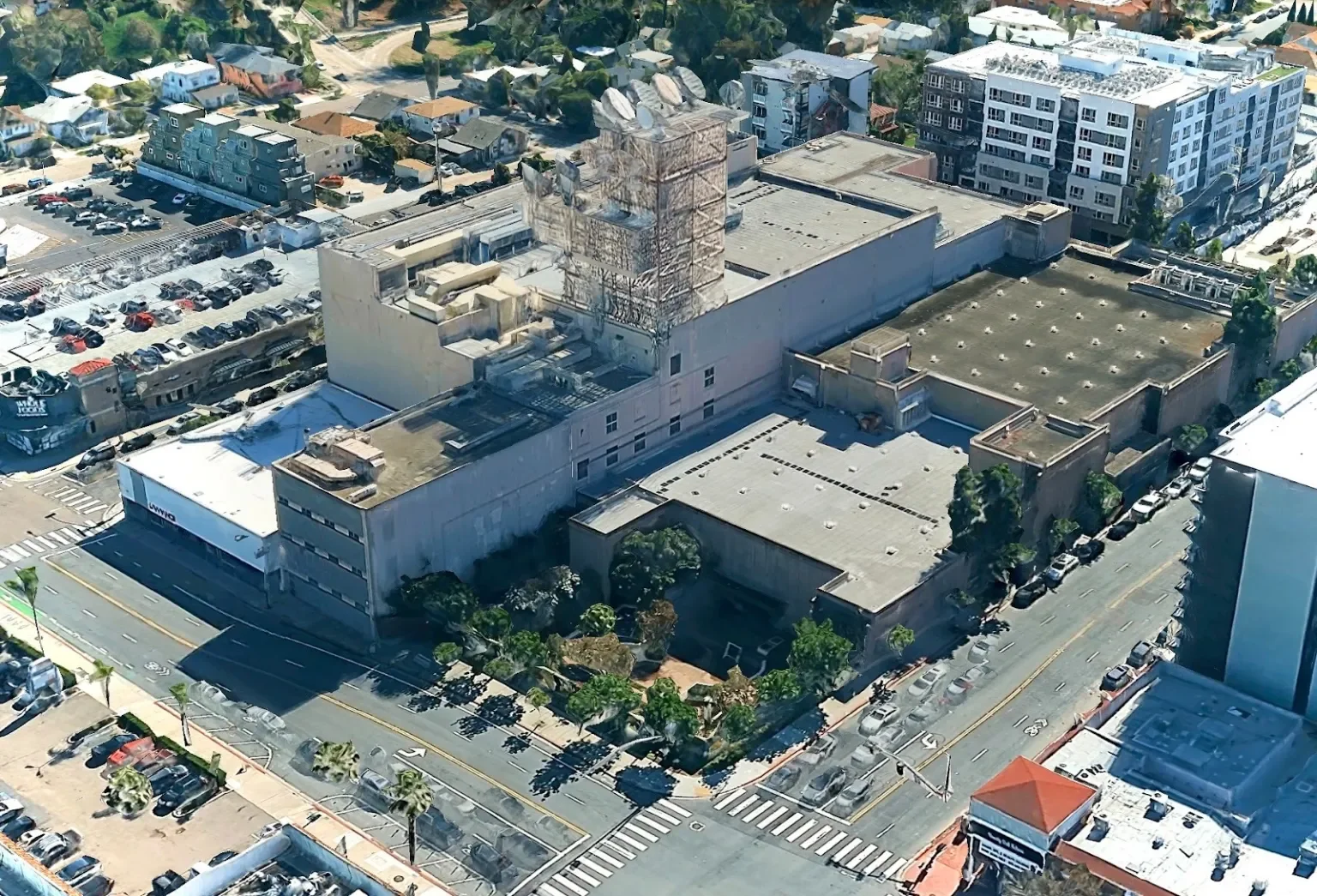 Satellite view of the AT&T Hillcrest location. This was captured before the microwave tower was removed in 2025. The employee patio, or “sunken garden,” lies below. (Image courtesy of Google Earth)
