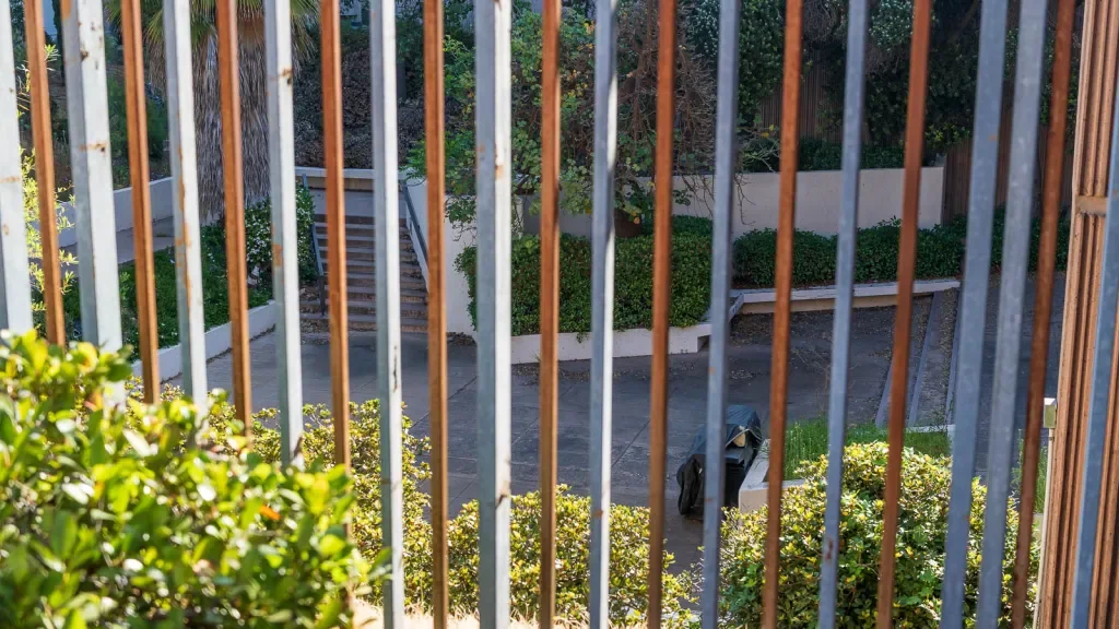 The "sunken garden" at AT&T's Hillcrest property is blocked from street view behind metal bars and mural-covered walls. It's so well hidden that most locals don't even know it's there. (Photo by Thomas Murphy/Times of San Diego)
